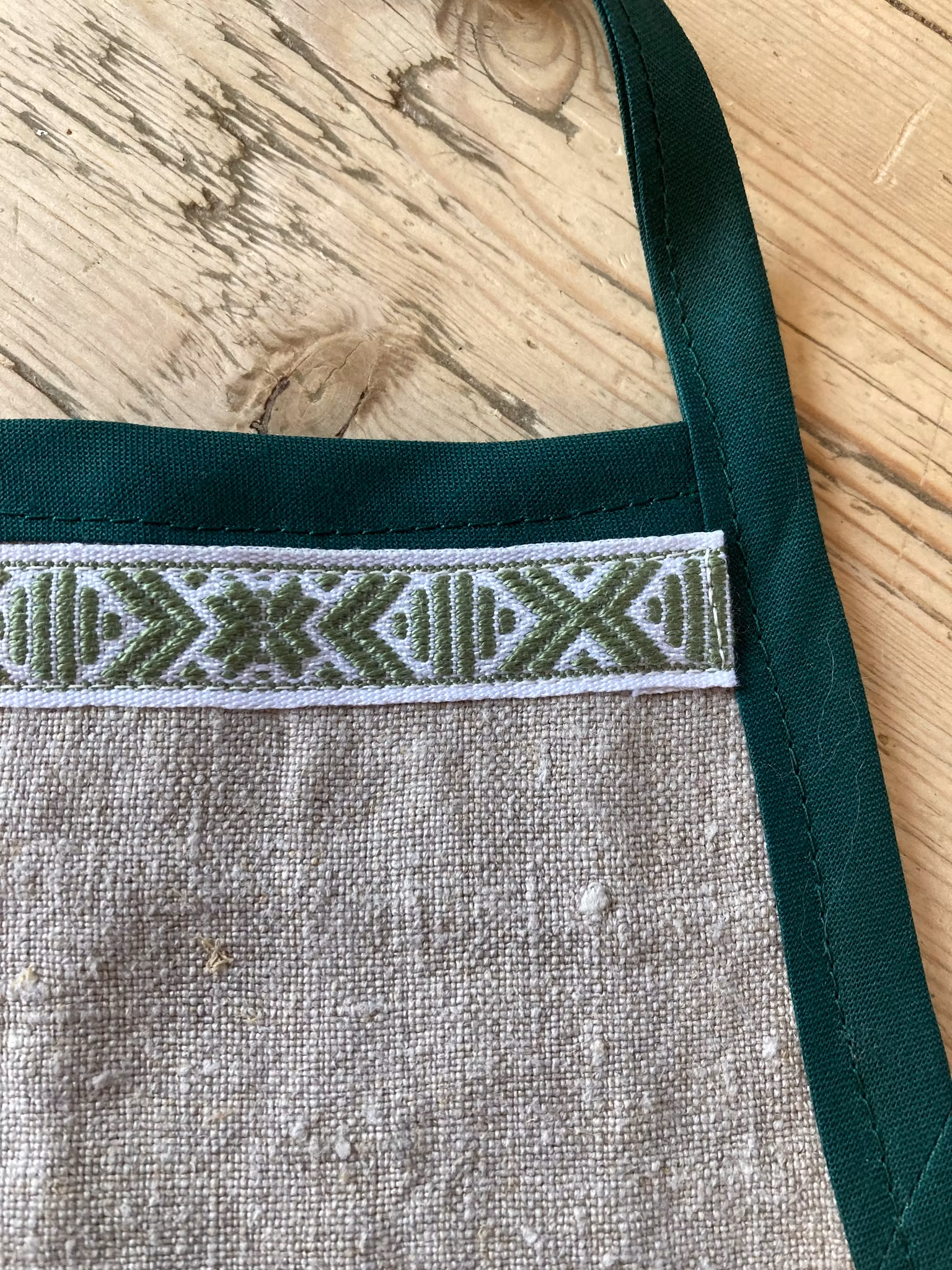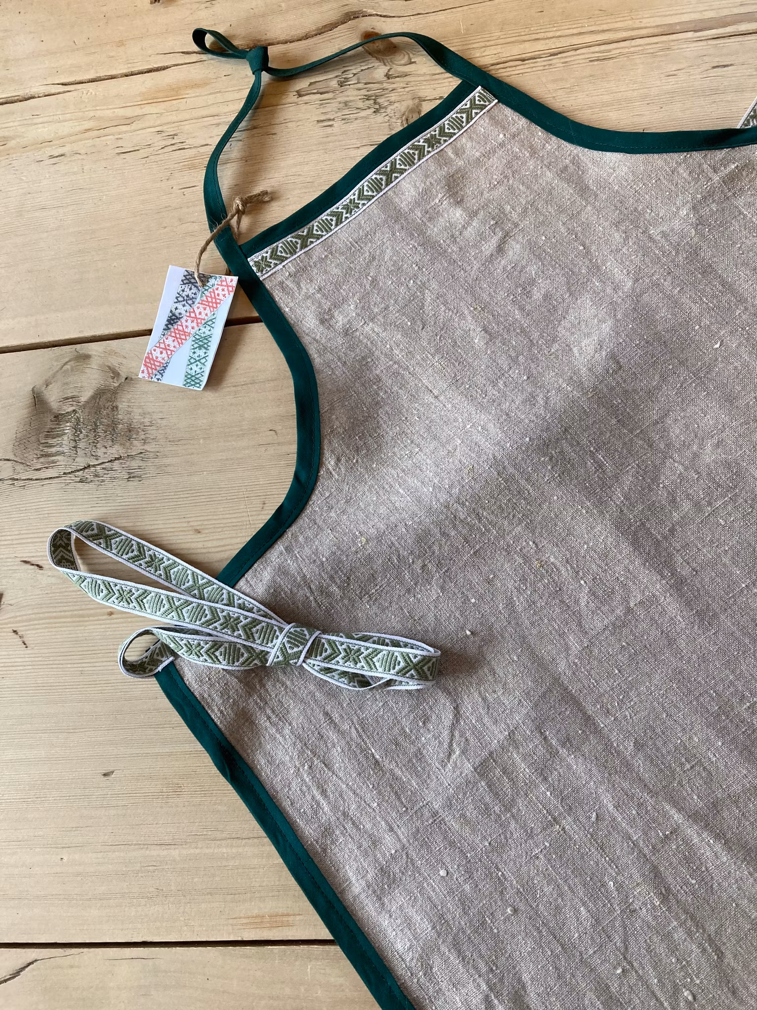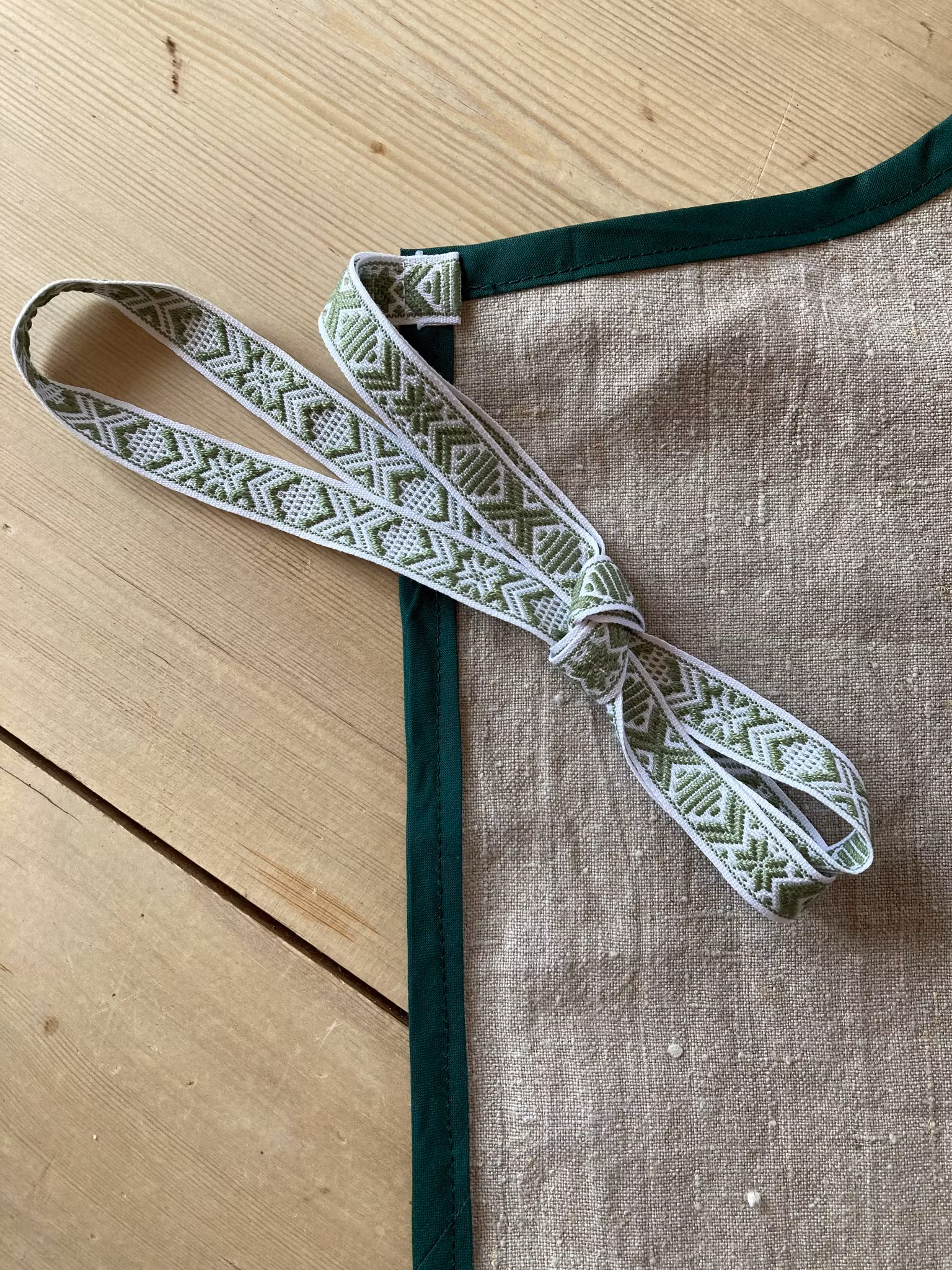 One of a kind - Grönt leksandsband. Förkläde i 100% linne med grön bandkant. Längd 78 cm och bredd 54 cm. Knytbandet är 184 cm. Skötselråd: Tvättas i max. 40 grader. Tyget är tvättat före sömnad - det krymper inte vid nästa tvätt!
